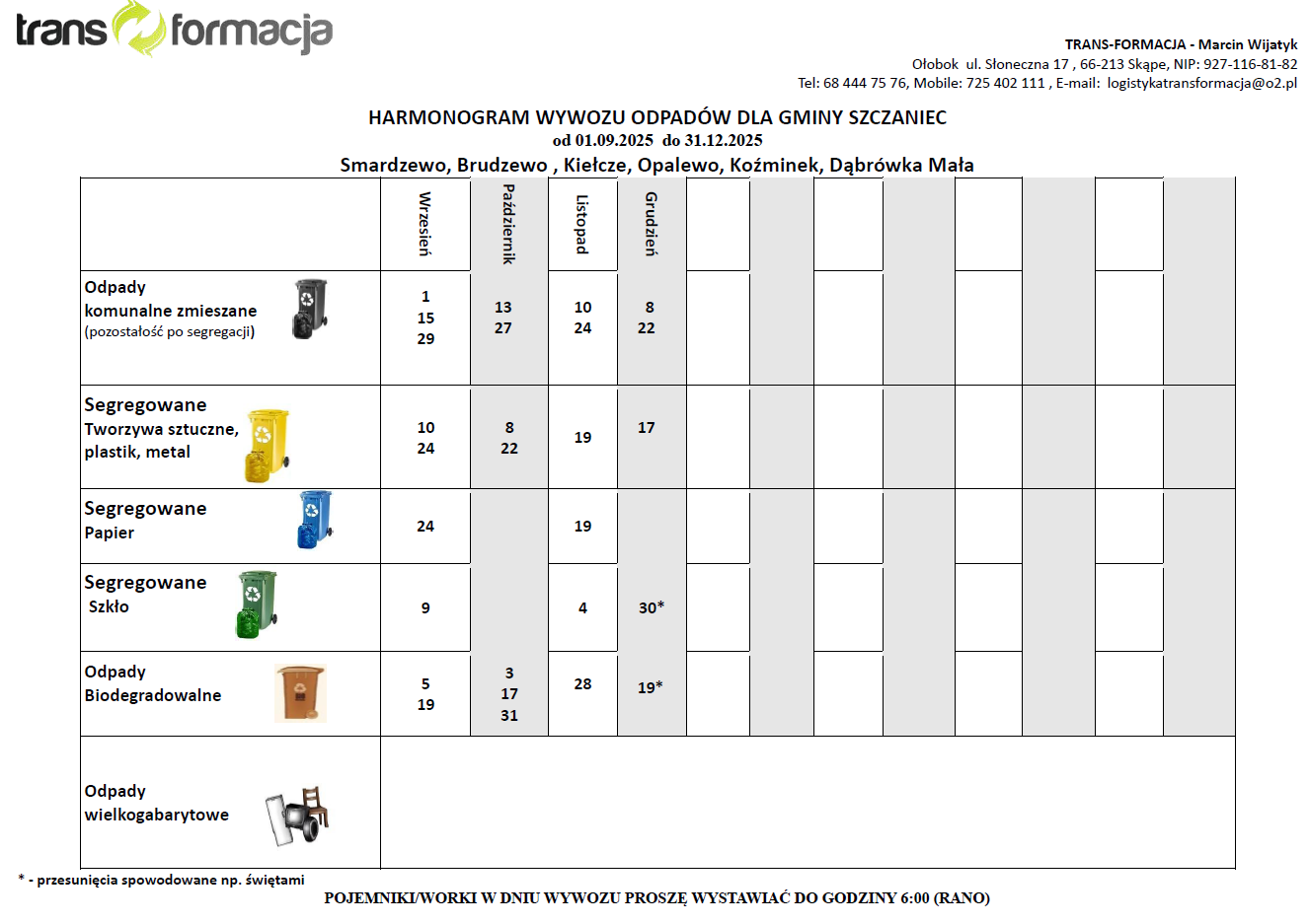 HARMONOGRAM WYWOZU ODPADÓW OD WRZEŚNIA DO GRUDNIA 2025 R.