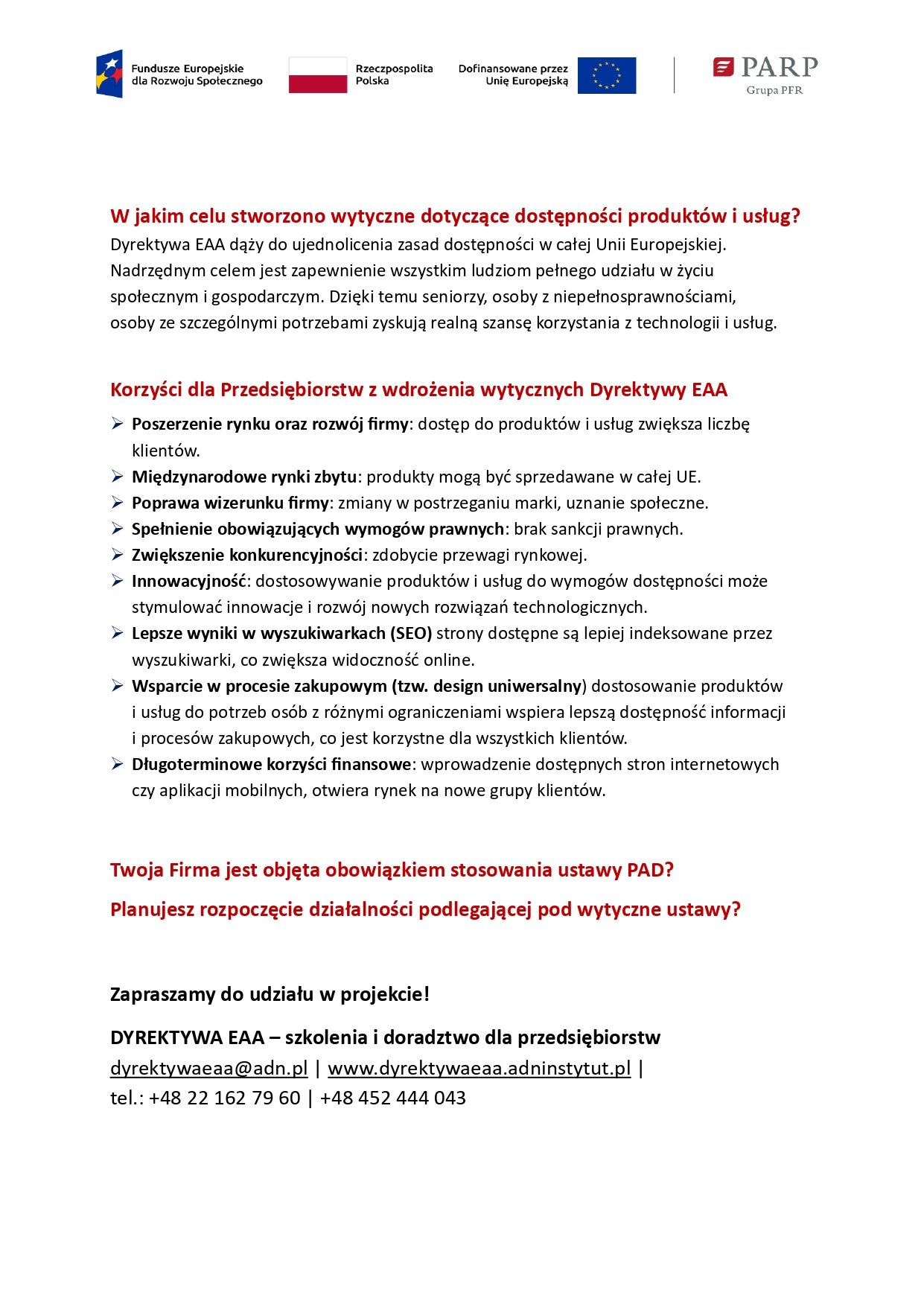 Polski Akt o Dostępności – Dostępność gwarantuje sukces! Projekt skierowany jest do firm objętych wymogami PAD oraz do przedsiębiorstw, które planują działania gospodarcze objęte obowiązkiem stosowania ustawy.